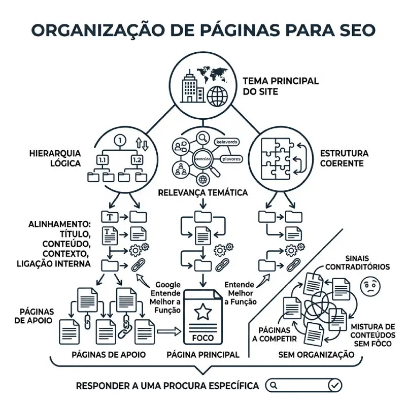 Quando esta organização existe, o Google entende melhor a função de cada URL, a relação entre páginas principais e páginas de apoio, e a relevância temática do site como um todo. Quando não existe, o site torna-se uma mistura de conteúdos sem foco, com sinais contraditórios e pouca capacidade de consolidação semântica.