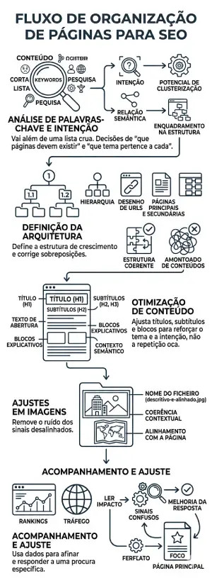 Organização de páginas para SEO é o processo de estruturar um site para que cada página tenha um papel definido no posicionamento orgânico. Isso inclui a escolha do tema principal de cada URL, a separação correta das intenções de pesquisa, a criação de uma hierarquia lógica e o alinhamento entre título, conteúdo, contexto e ligação interna.