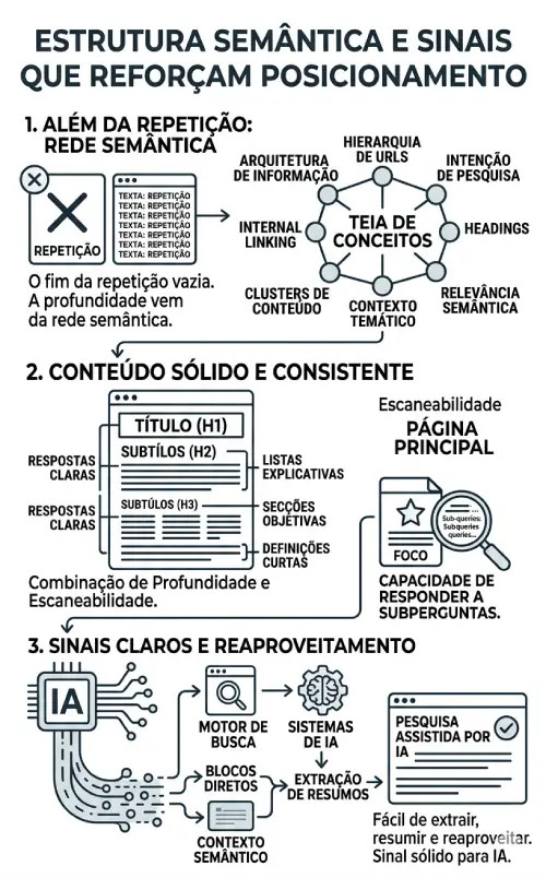Isto não é enfeite técnico. É sinal. Quando uma página trabalha o tema com amplitude e consistência, o motor de busca percebe que não está perante um texto montado só para bater numa keyword. Está perante conteúdo que cobre o assunto de forma mais sólida, com mais capacidade de responder a subperguntas e mais hipóteses de ser reutilizado em experiências de pesquisa assistida por IA.